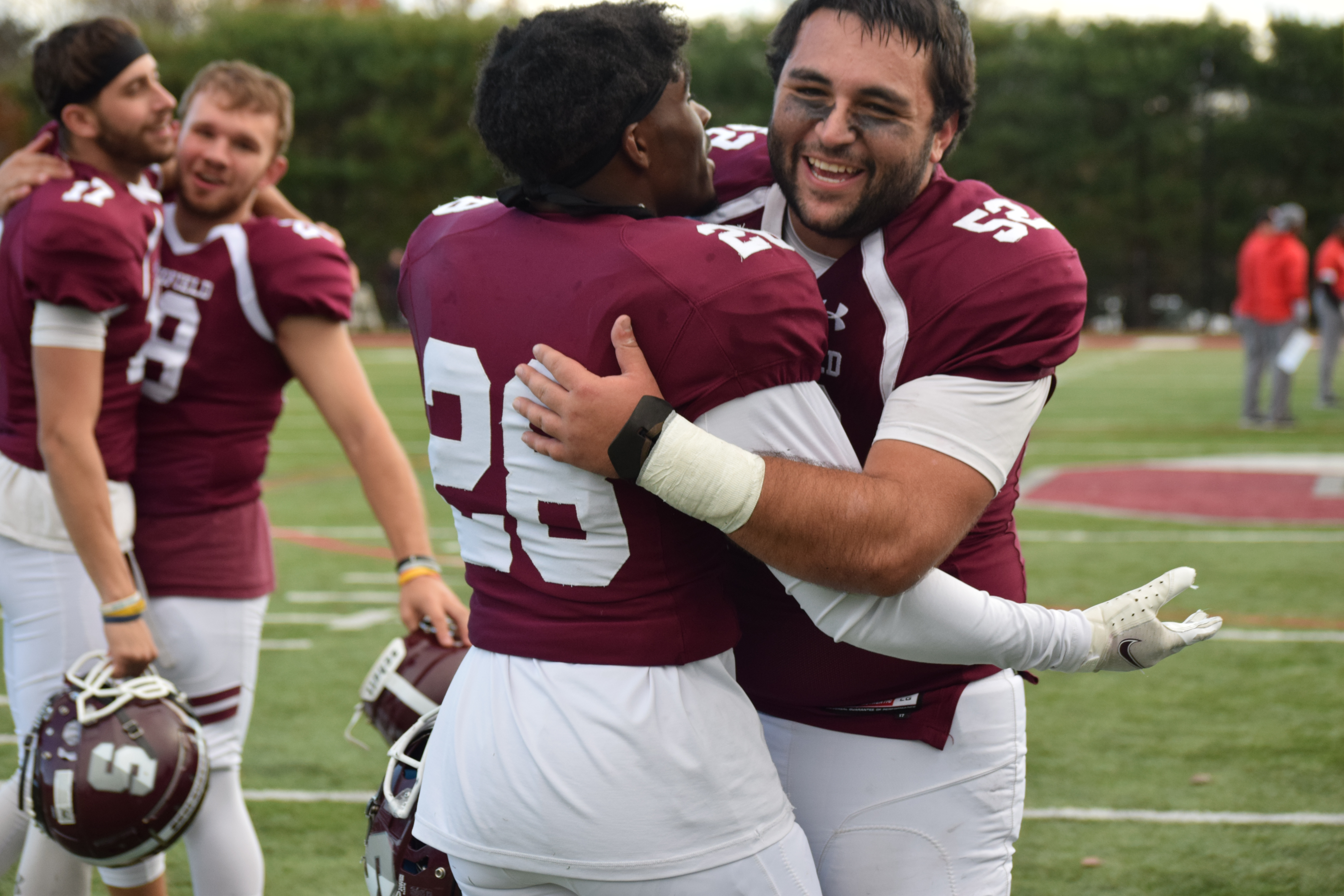 The bleachers at Stagg Field, filled with students, families and fans, erupted as the celebration began on the turf. Springfield College President Mary-Beth Cooper delivered the NEWMAC trophy to the team as players posed for a picture. “The Brotherhood” erupted in song, scream-singing Eddie Money.